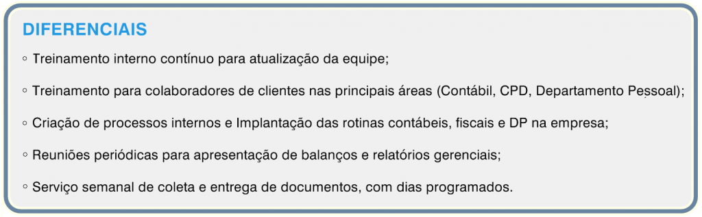 Os serviços contemplam, de forma geral, a obtenção dos dados referentes às transações da empresa e sua inclusão nos sistemas contábil e fiscal, as revisões, análises e conciliações de contas, a preparação de balancetes, balanços e demonstrações de resultado nos formatos legais, encerramento dos livros fiscais e preparação das guias de recolhimento dos impostos.